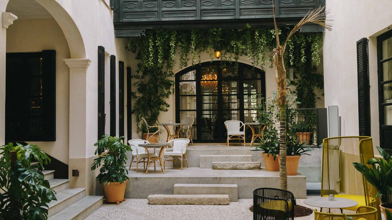 Just as the interior finds itself in the grip of creepers and untamed greenery, so does the hotel’s Restaurant Botànic. Not only does its menu reflect the hotel’s botanical inclinations, it is a paean to the farm-to-fork, 0-kilometre philosophy and to the island’s fertile soil. Chef Andres Benitez pulls in ingredients from trusted local farms and serves up a refined, plant-forward take on rustic Mallorcan food. Cocktails also embrace the go-slow, plant theme – expect gin from local distilleries garnished with island herbs. Breakfast shows off the island’s bounty and culinary heritage with plates such as eggs with cured sobrasada and mahon cheese or oatmeal and banana pancakes with local orange molasses from Soller.