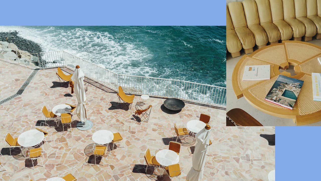 An inky illustration of a reclining sunbather stretches out behind the bar and reaffirms the assignment. Cane chairs and low-slung, linen-dressed sofas belong to a far cooler era – a ’60s and ’70s mash-up reinforced by a tan palette of peaches, terracottas, creams and coffees. Near-brutalist balconies, softened with white and pinned with tanned butterfly chairs, tip over the glistening French Riviera where sunbathers are dealt the occasional spray of crashing waves. It’s a modish, coastal scene by French hotel group Beaumier – one of abstract art, retro touches and raffia, with oat-linen curtains framing that pure Riviera light.